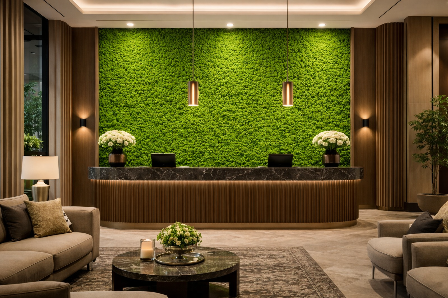Preserved greenery enhances reception areas, lounges, restaurants, and common areas with an elegant and contemporary visual impact. Each project is developed based on the space, customer target, and brand identity.